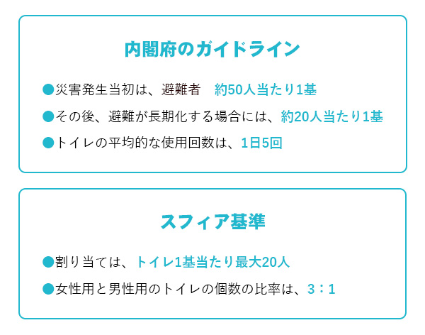 内閣府が発行している「避難所におけるトイレの確保・管理ガイドライン」に、目安となるトイレの個数が記されています。また、近年では国際的な基準であるスフィア基準も重要視されています。